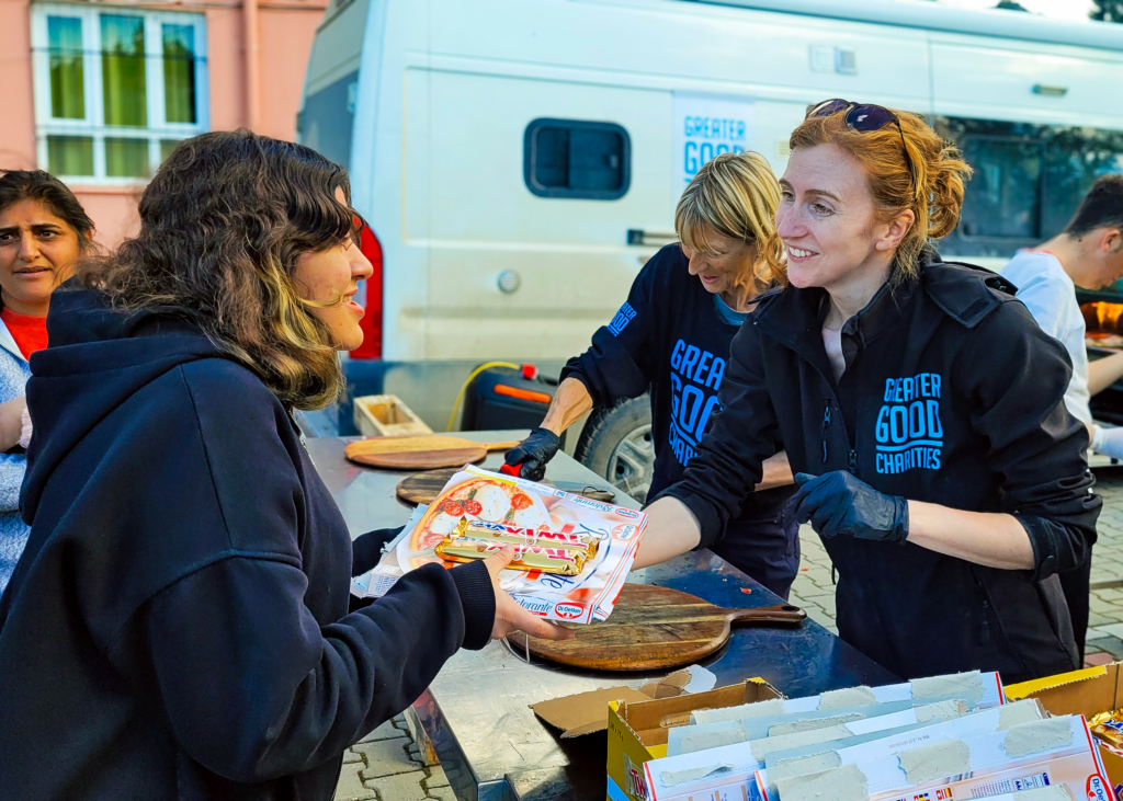 By mid-March, Greater Good Charities established a kitchen at a school in Samankaya, feeding thousands a day there and at our other distribution sites. By establishing contact with a network of local mayors, we significantly expanded our pizza service and established a source for fridges and freezers for the school.