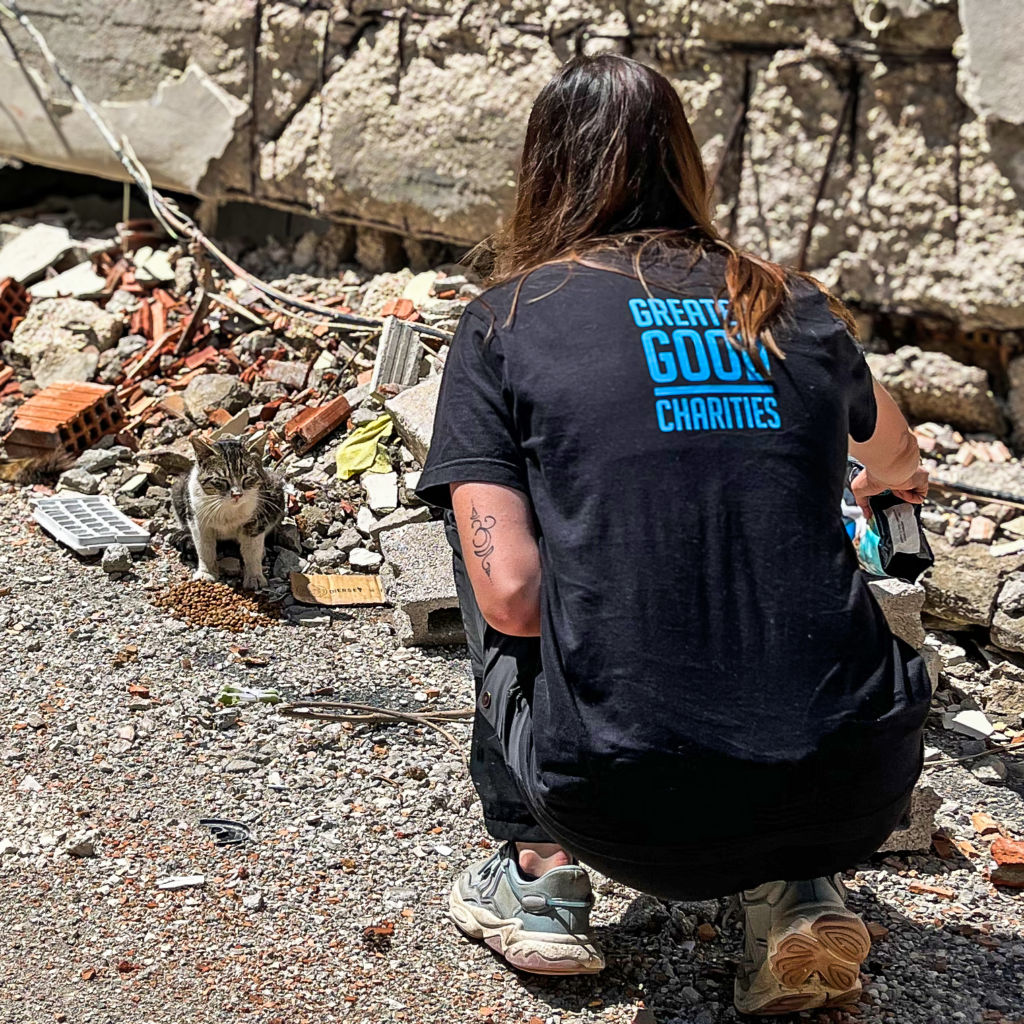 While on the ground for 60 days, Greater Good Charities provided over 250,000 hot meals to thousands of earthquake victims, refugees, and rescue workers in Türkiye, with support from 70 volunteers. Our field response team fed animals and collaborated with local animal welfare organizations to help provide food to pets rescued from the rubble.